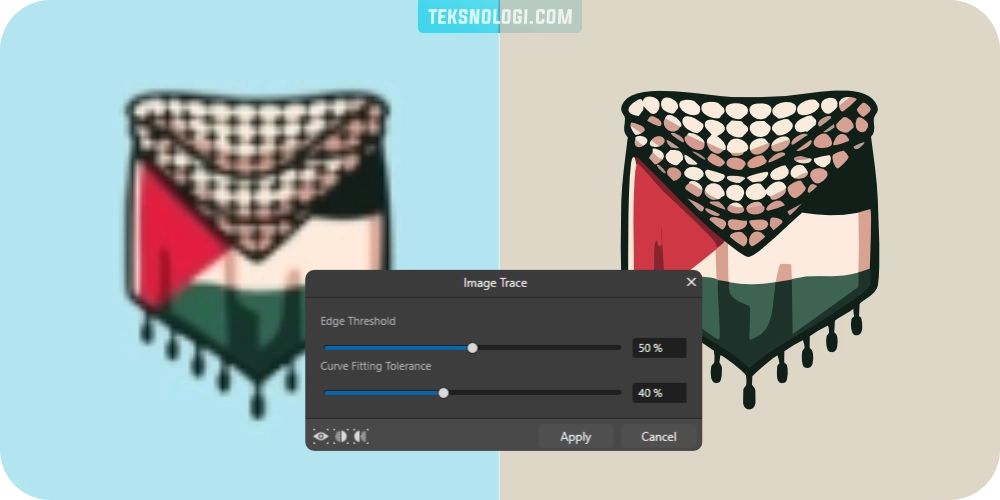 Secara otomatis Affinity akan mengconvert gambar raster menjadi vector yang lebih halus. Kita juga bisa mengatur parameternya melalui slider yang bisa digeser ke kiri dan kanan.